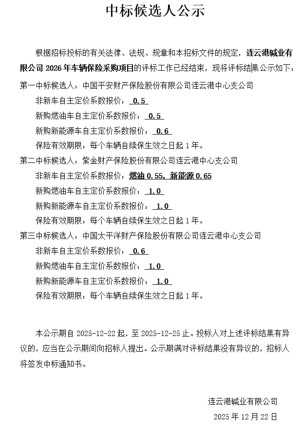 連云港堿業(yè)有限公司2026年車輛保險采購項目中標(biāo)候選人公示