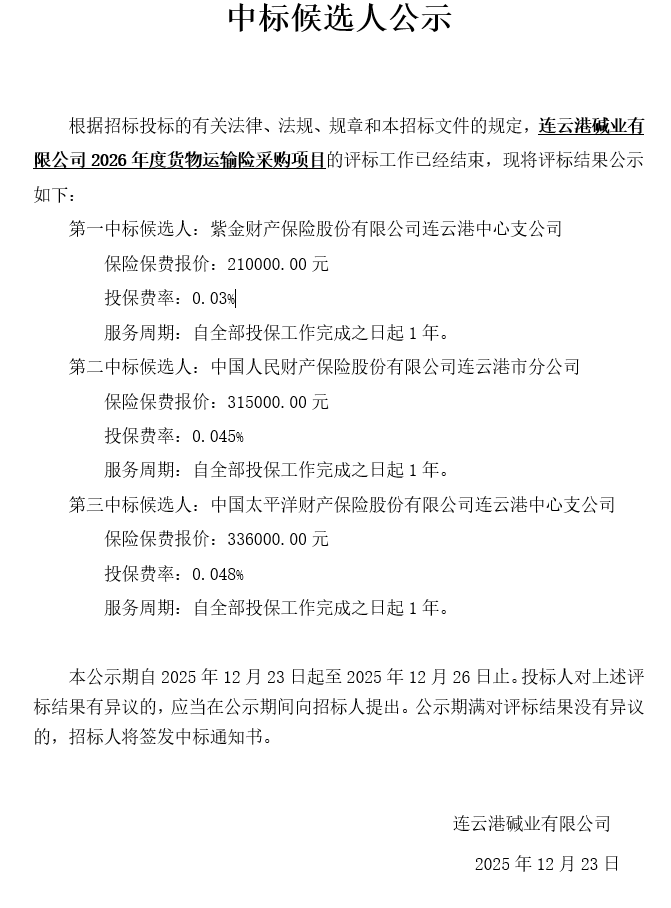 連云港堿業(yè)有限公司2026年度貨物運(yùn)輸險(xiǎn)采購項(xiàng)目中標(biāo)候選人公示