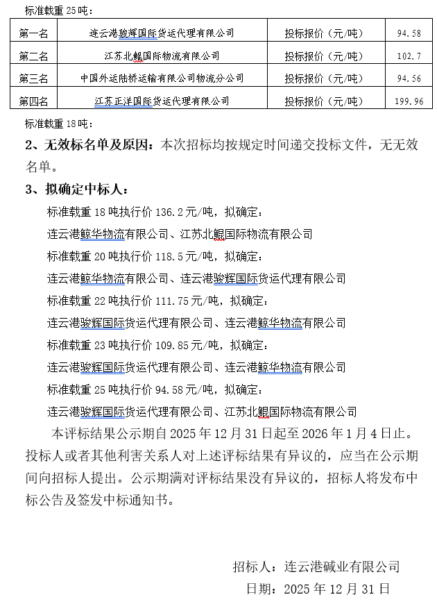 連云港堿業(yè)有限公司外貿(mào)集裝箱貨運代理服務(wù)商招標中標候選人公示